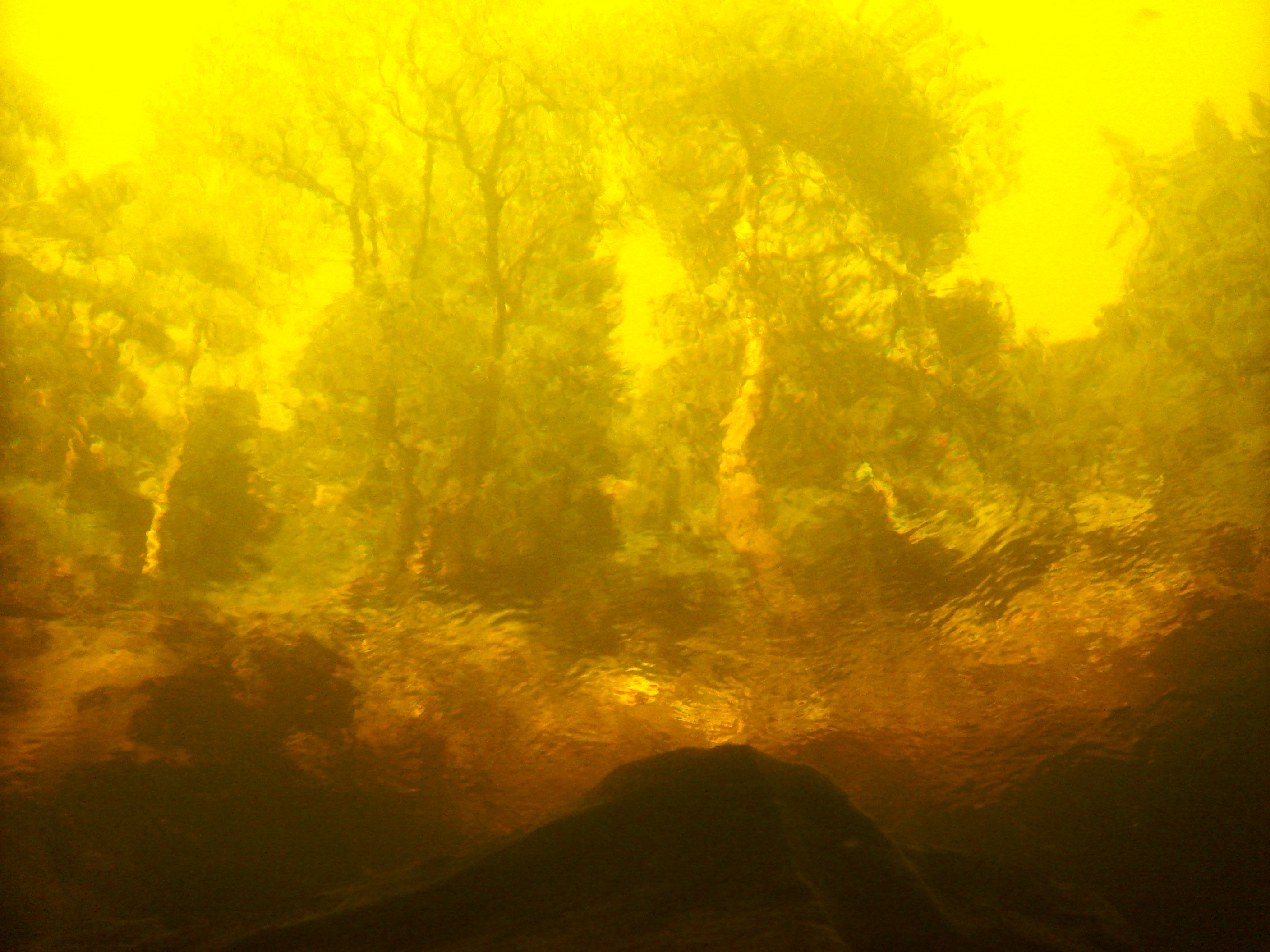 Did this in mid summer with a drysuit and got a cracking photo from about 8 metres down – I know not really swimming but was a great dive!! The picture below shows the trees on the cliff top above the water surface. The yellow colouring is completely natural – no filters or computer tricks – just the peaty water!