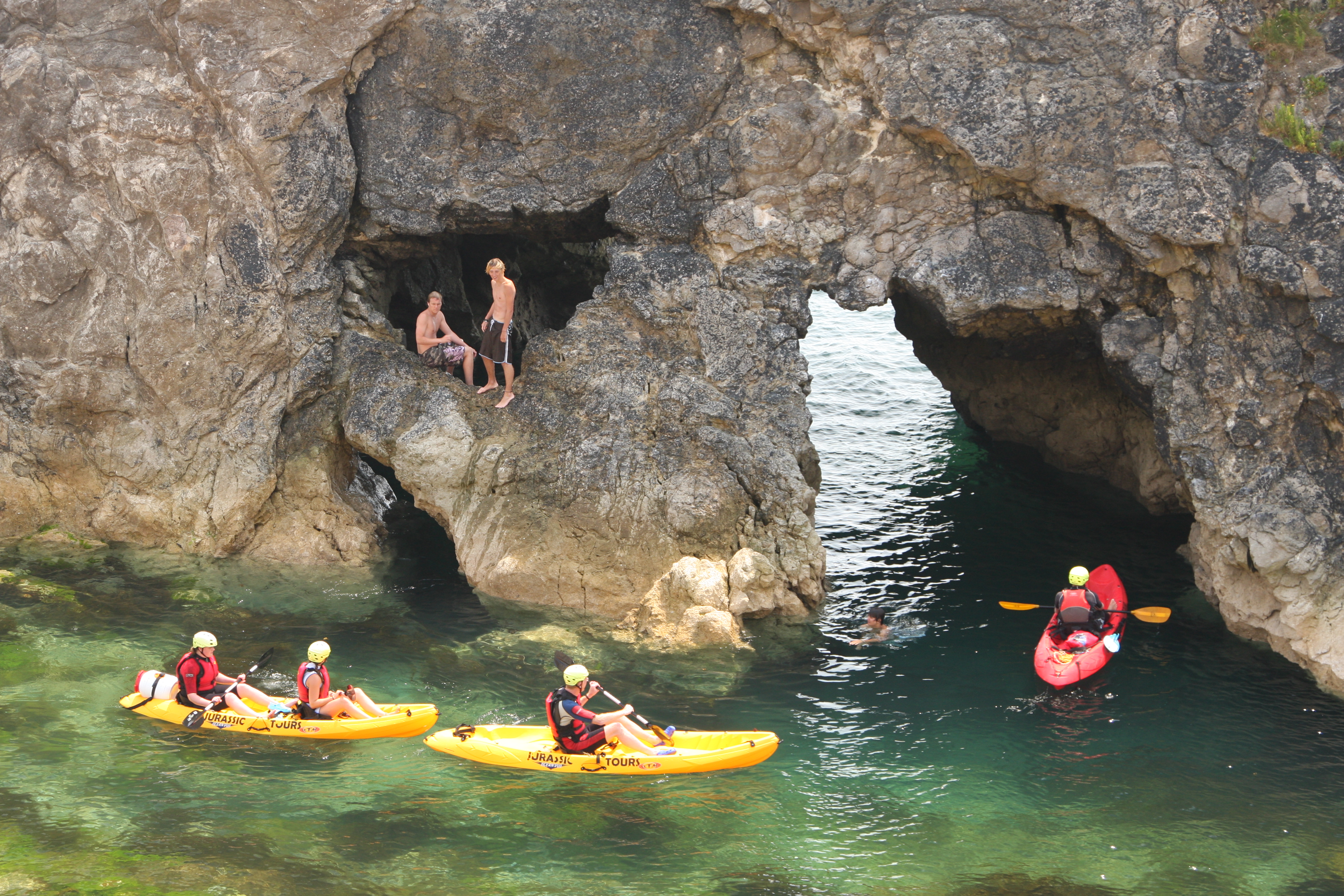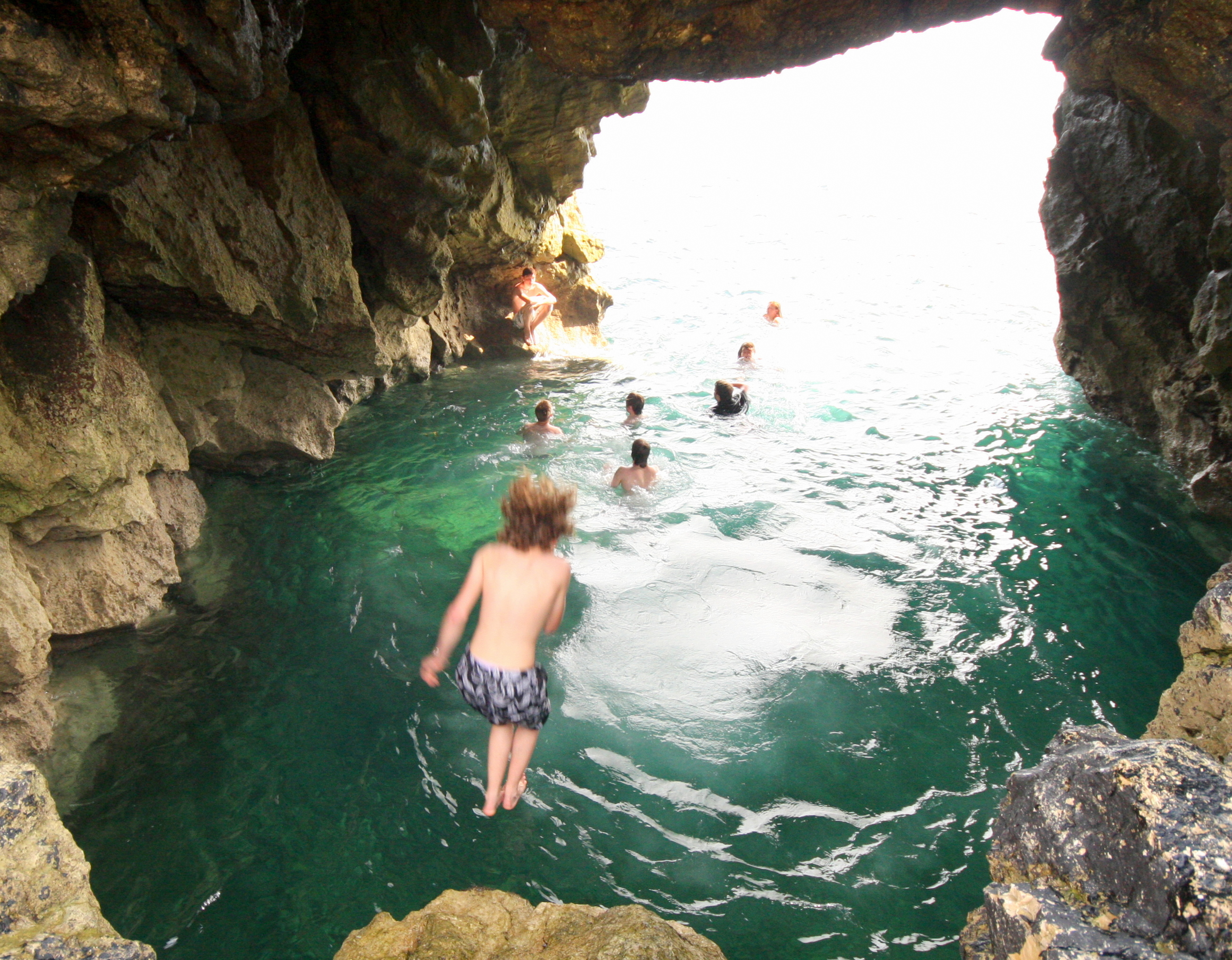 Scramble down to inland lagoon with sea caverns and arches. Amazing rock formations and great swimming (HT only).
