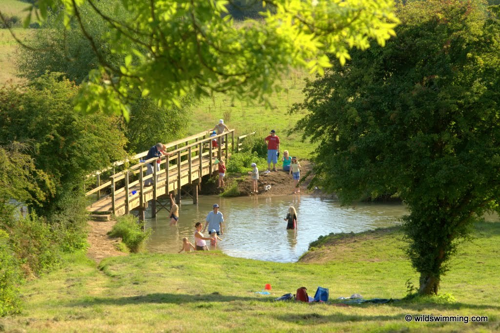 Pretty footbridge and clear, clean, shallow river on grassy banks below gentle Cotswold escarpment. Does not deepen to more than 80cm. This is the sight of the first ever dinosaur find. Hunt for fossils and also examine the old Roman villa.